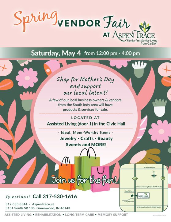 Don't forget to support your local vendors and stop by our Spring Vendor Fair this Saturday, May 4! You can do some Mother's Day shopping and/or simply treat yourself! Enter through Assisted Living, door 1 (facing HWY 135). The event will be going on from 12-4 PM. See you then!